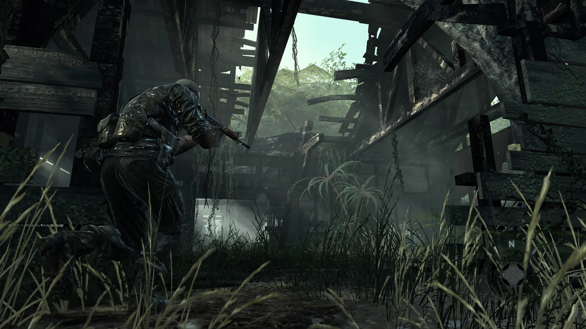 Celerium was the second part of a 1 two punch. In Pyrrhic Victory we emulated what was great about past Call of Duty games. Celerium was to show the player a new and exciting design unlike what they’ve seen before in past Call of Duty games. Every encounter in the outdoor area has a wide linearity, allowing players to choose their own path through the engagement. Making decisions on where and how they’d like to engage the enemy, be it hacking a drone’s weapon system and using its mini-gun or taking a back path through the ruins to flank shielded troops, each decision is valid and has its own unique play style flavor. Decoration and optimization in this map was a challenge. With the constant particles, vegetation and wet textures it was constant battle to keep the map at a high frame rate. I really enjoyed creating the ruins section and utilized it as a landmark that players can see and anchor themselves to giving a good sense of progress as they battle through the area.