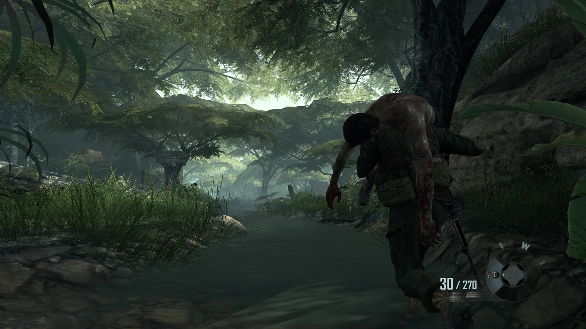 I was primarily responsible for the level design of the 3rd Act of this level which contained a guided stealth event and what I like to call a Defensive Retreat sequence. I really enjoyed working on a battle that wasn’t a simple head on battle and was in fact a retreat that escalated in intensity. Each area in that sequence is viewed from two directions so it was important to take advantage of landmarking and visual language to give the player a sense of the direction they’re headed. By having the player follow a stream headed to shore allowed me to establish a compass with the added combination of smoke grenades signaling when it was time to move along with the audio cues. Jungle levels have a bad tradition of being visually noisy and confusing to navigate. I utilized constant landmarks and visual anchors such as having one side of the pathway being rocky and the other side being more forested. This in combination with the river I think gives the level a very good sense of directional grounded-ness